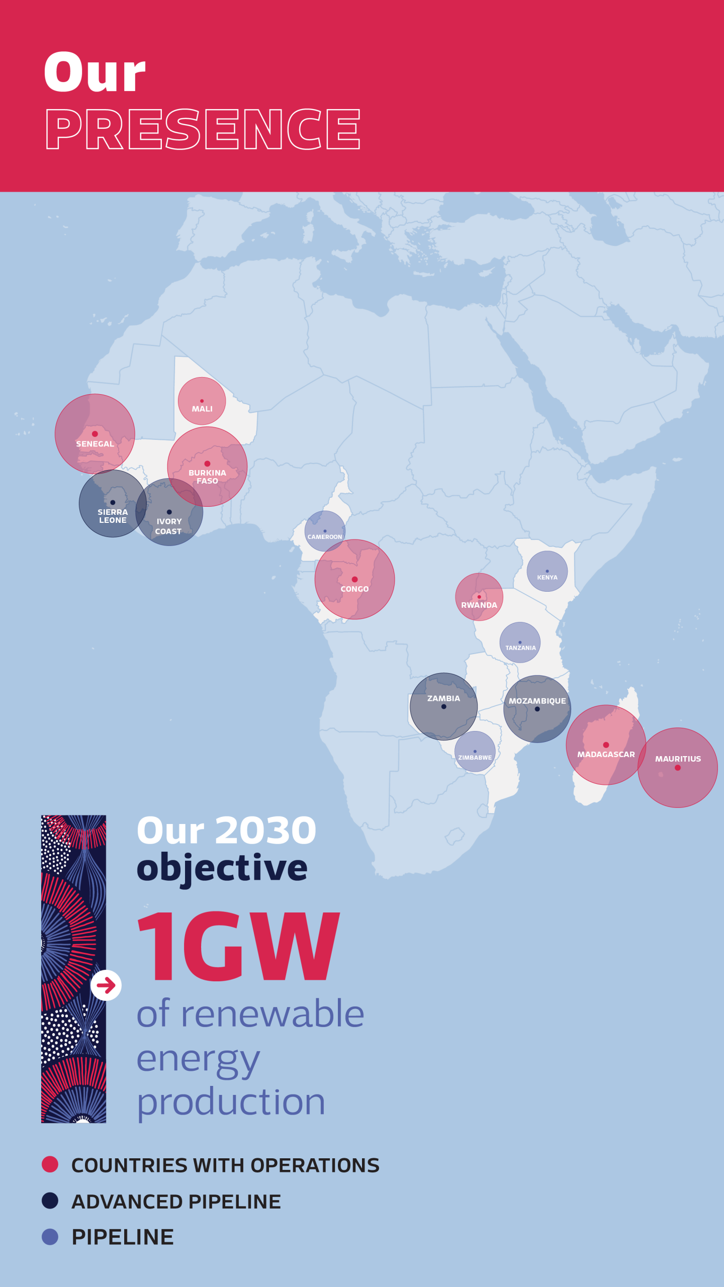 MALI ZAMBIA IVORY C O AST M OZAMBIQUE SENEGAL BURKINA F ASO BENIN MA DA GASCAR M A URITIUS R W AN D A SIERRA LEONE COUNTRIES WITH OPER A TIONS IN DEVELOPMENT Our 2030 objective OUR PRESENCE of installed r enewable power 1GW KEN Y A T ANZANIA